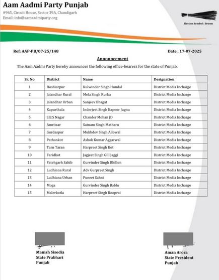 ਆਪ ਨੇ15 ਮੀਡੀਆ ਇੰਚਾਰਜਾਂ ਦਾ ਕੀਤਾ ਐਲਾਨ