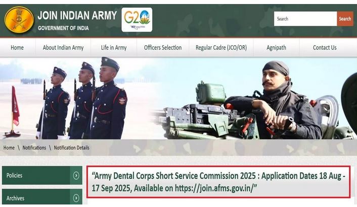 ਨਵੀਂ ਦਿੱਲੀ, 19 ਅਗਸਤ – ਮੈਡੀਕਲ ਖੇਤਰ ‘ਚ ਕਰੀਅਰ ਬਣਾਉਣ ਦੀ ਖ਼ਾਹਿਸ਼ ਰੱਖਣ ਵਾਲੇ ਨੌਜਵਾਨਾਂ ਲਈ ਵੱਡੀ ਖ਼ਬਰ ਹੈ। ਭਾਰਤੀ ਫੌਜ ਨੇ ਆਰਮੀ ਡੈਂਟਲ ਕੌਰਪਸ ਸ਼ਾਰਟ ਸਰਵਿਸ ਕਮਿਸ਼ਨ ਭਰਤੀ 2025 ਲਈ ਨੋਟੀਫਿਕੇਸ਼ਨ ਜਾਰੀ ਕਰ ਦਿੱਤਾ ਹੈ ਅਤੇ ਅਰਜ਼ੀ ਪ੍ਰਕਿਰਿਆ ਸ਼ੁਰੂ ਕਰ ਦਿੱਤੀ ਹੈ। ਜੋ ਵੀ ਉਮੀਦਵਾਰ ਇਸ ਭਰਤੀ ਲਈ ਯੋਗਤਾ ਪੂਰੀ ਕਰਦੇ ਹਨ, ਉਹ ਆਨਲਾਈਨ ਮੋਡ ਰਾਹੀਂ ਅਧਿਕਾਰਤ ਵੈਬਸਾਈਟ join.afms.gov.in ‘ਤੇ ਜਾ ਕੇ ਫਾਰਮ ਭਰ ਸਕਦੇ ਹਨ। ਆਨਲਾਈਨ ਫਾਰਮ ਭਰਨ ਦੀ ਆਖਰੀ ਮਿਤੀ 17 ਸਤੰਬਰ 2025 ਨਿਰਧਾਰਤ ਕੀਤੀ ਗਈ ਹੈ।