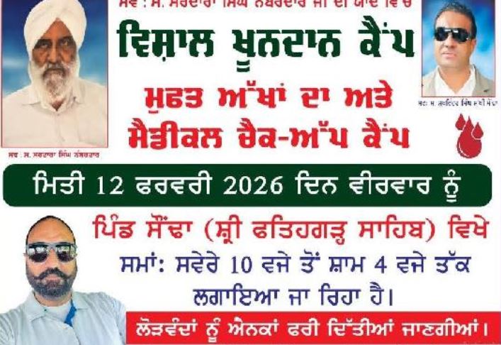 ਪਿੰਡ ਸੋਂਢਾ ਵਿਖੇ ਖੂਨ ਦਾਨ ਅਤੇ ਮੈਡੀਕਲ ਕੈਂਪ ਕੱਲ 12 ਫਰਵਰੀ (ਵੀਰਵਾਰ) ਨੂੰ