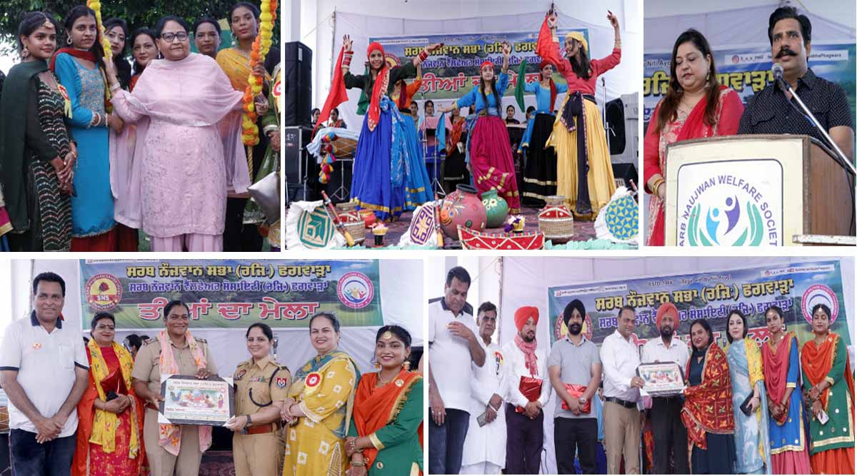 ਫਗਵਾੜਾ,8 ਅਗਸਤ (ਏ.ਡੀ.ਪੀ ਨਿਊਜ਼) – ਸਰਬ ਨੌਜਵਾਨ ਸਭਾ ਰਜਿ. ਫਗਵਾੜਾ ਅਤੇ ਸਰਬ ਨੌਜਵਾਨ ਵੈਲਫੇਅਰ ਸੁਸਾਇਟੀ ਫਗਵਾੜਾ ਵਲੋਂ ਸਾਉਣ ਦਾ ਪ੍ਰਸਿੱਧ ਤੀਜ ਉਤਸਵ ‘ਮੇਲਾ ਤੀਆਂ ਦਾ’ ਸਥਾਨਕ ਪਲਾਹੀ ਰੋਡ ਸਥਿਤ ਆਰੀਆ ਆਈ.ਐਮ.ਟੀ ਕਾਲਜ ਦੇ ਵਿਹੜੇ ਵਿੱਚ ਹਰ ਸਾਲ ਦੀ ਤਰ੍ਹਾਂ ਬੜੇ ਉਤਸ਼ਾਹ ਨਾਲ ਮਨਾਇਆ ਗਿਆ। ਸਭਾ ਦੇ ਪ੍ਰਧਾਨ ਸੁਖਵਿੰਦਰ ਸਿੰਘ ਦੀ ਅਗਵਾਈ ਹੇਠ ਆਯੋਜਿਤ ਸਮਾਗਮ ਵਿੱਚ ਮੁੱਖ ਮਹਿਮਾਨ ਵਜੋਂ ਗੁਰਮੀਤ ਕੌਰ ਐਸ.ਪੀ.ਡੀ. ਅਤੇ ਐੱਸ.ਪੀ.ਫਗਵਾੜਾ ਨੇ ਸ਼ਿਰਕਤ ਕੀਤੀ। ਜਦਕਿ ਵਿਸ਼ੇਸ਼ ਮਹਿਮਾਨਾਂ ਵਜੋਂ ਹਲਕਾ ਵਿਧਾਇਕ ਬਲਵਿੰਦਰ ਸਿੰਘ ਧਾਲੀਵਾਲ, ਸਮਾਜ ਸੇਵਿਕਾ ਅਨੀਤਾ ਸੋਮ ਪ੍ਰਕਾਸ਼ ਤੋਂ ਇਲਾਵਾ ਜਰਨੈਲ ਨੰਗਲ ਚੇਅਰਮੈਨ ਨਗਰ ਸੁਧਾਰ ਟਰੱਸਟ ਫਗਵਾੜਾ, ਤਵਿੰਦਰ ਰਾਮ ਚੇਅਰਮੈਨ ਮਾਰਕੀਟ ਕਮੇਟੀ ਫਗਵਾੜਾ, ਸੁਰਿੰਦਰ ਕੁਮਾਰੀ ਈ.ਓ. ਅੰਮ੍ਰਿਤਸਰ, ਊਸ਼ਾ ਰਾਣੀ ਐੱਸ.ਐੱਚ.ਓ. ਸਿਟੀ, ਰਾਜਵਿੰਦਰ ਕੌਰ ਸੀ.ਡੀ.ਪੀ.ਓ., ਸੋਸ਼ਲ ਮੀਡੀਆ ਸਟਾਰ ਪ੍ਰਭ ਸਿੰਘ, ਅਮਨਪ੍ਰੀਤ ਕੌਰ, ਸੰਤੋਸ਼ ਕੁਮਾਰ ਗੋਗੀ ਜਿਲਾ ਸਕੱਤਰ ਆਮ ਆਦਮੀ ਪਾਰਟੀ, ਰਘਬੀਰ ਕੌਰ ਹਲਕਾ ਕੁਆਰਡੀਨੇਟਰ ਆਮ ਆਦਮੀ ਪਾਰਟੀ, ਪ੍ਰਿਤਪਾਲ ਕੌਰ ਤੁੱਲੀ ਕੌਂਸਲਰ, ਗੁਰਪ੍ਰੀਤ ਕੌਰ ਜੰਡੂ ਮੌਜੂਦ ਰਹੇ।