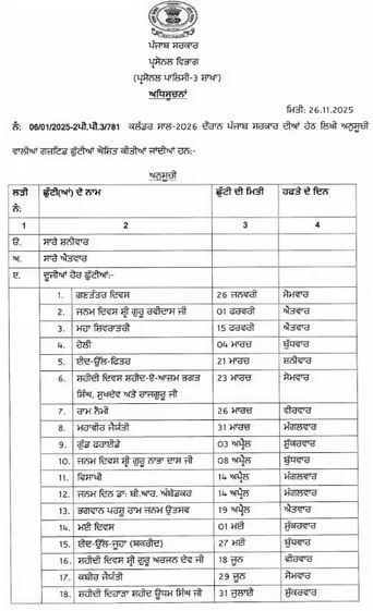 ਪੰਜਾਬ ਸਰਕਾਰ ਨੇ ਜਾਰੀ ਕੀਤਾ ਸਾਲ 2026 ਲਈ ਛੁੱਟੀਆਂ ਦਾ ਕਲੰਡਰ