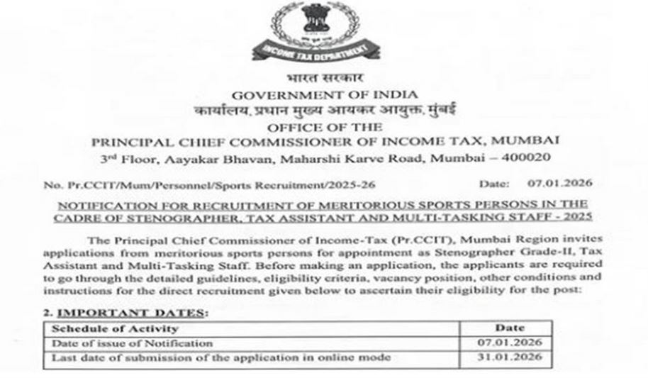 ਨਵੀਂ ਦਿੱਲੀ, 28 ਜਨਵਰੀ - ਆਮਦਨ ਕਰ ਵਿਭਾਗ ਸਟੈਨੋਗ੍ਰਾਫਰ ਗ੍ਰੇਡ II, ਟੈਕਸ ਸਹਾਇਕ, ਅਤੇ ਐਮਟੀਐਸ…