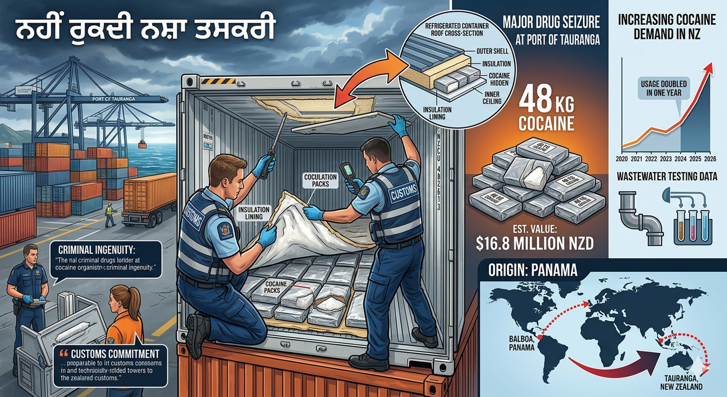 *ਟੌਰੰਗਾ ਬੰਦਰਗਾਹ ’ਤੇ ਵੱਡੀ ਕਾਰਵਾਈ: ਕੰਟੇਨਰ ਦੀ ਛੱਤ ਵਿੱਚੋਂ 48 ਕਿੱਲੋ ਕੋਕੀਨ ਬਰਾਮਦ *ਪਨਾਮਾ ਦੇ…