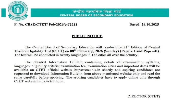 CBSE ਦੇ ਅਧਿਕਾਰਤ ਨੋਟੀਫਿਕੇਸ਼ਨ ਦੇ ਅਨੁਸਾਰ, CBSE CTET ਪ੍ਰੀਖਿਆ 8 ਫਰਵਰੀ, 2026 ਨੂੰ 132 ਸ਼ਹਿਰਾਂ ਵਿੱਚ ਹੋਵੇਗੀ। ਇਸ ਵਾਰ, CBSE ਆਪਣਾ 21ਵਾਂ ਐਡੀਸ਼ਨ (ਪੇਪਰ-1 ਅਤੇ ਪੇਪਰ-2) ਕਰਵਾਏਗਾ। ਇਹ ਪ੍ਰੀਖਿਆ ਕੁੱਲ 20 ਭਾਸ਼ਾਵਾਂ ਵਿੱਚ ਲਈ ਜਾਵੇਗੀ। ਪ੍ਰੀਖਿਆ, ਸਿਲੇਬਸ, ਭਾਸ਼ਾਵਾਂ, ਯੋਗਤਾ ਮਾਪਦੰਡ, ਪ੍ਰੀਖਿਆ ਫੀਸ, ਪ੍ਰੀਖਿਆ ਸ਼ਹਿਰਾਂ ਅਤੇ ਤਾਰੀਖਾਂ ਬਾਰੇ ਵਿਸਤ੍ਰਿਤ ਜਾਣਕਾਰੀ ਜਲਦੀ ਹੀ ਵੈੱਬਸਾਈਟ, ctet.nic.in ‘ਤੇ ਜਾਰੀ ਕੀਤੀ ਜਾਵੇਗੀ।