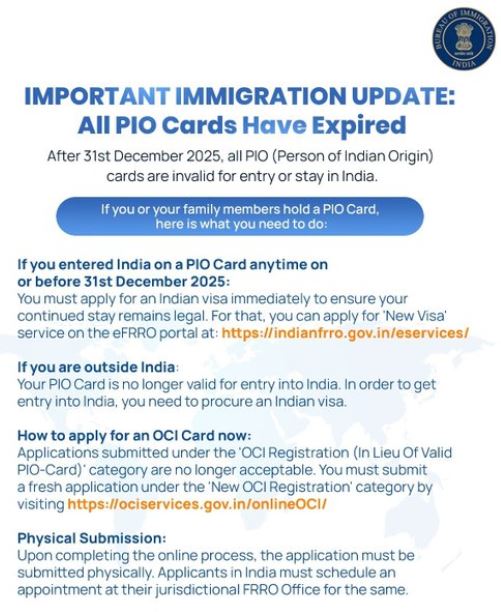 ਚੰਡੀਗੜ੍ਹ, 20 ਅਪ੍ਰੈਲ – ਭਾਰਤ ਸਰਕਾਰ ਨੇ ਹੁਕਮ ਜਾਰੀ ਕੀਤਾ ਹੈ ਕਿ ਸਾਰੇ PIO ਕਾਰਡ 31 ਦਸੰਬਰ 2025 ਤੋਂ ਬਾਅਦ ਖਤਮ ਹੋ ਗਏ ਹਨ ਅਤੇ ਹੁਣ ਭਾਰਤ ਵਿੱਚ ਦਾਖਲੇ ਜਾਂ ਰਹਿਣ ਲਈ ਵੈਧ ਨਹੀਂ ਹਨ। ਜੇਕਰ ਤੁਹਾਡੇ ਕੋਲ ਜਾਂ ਤੁਹਾਡੇ ਪਰਿਵਾਰ ਦੇ ਮੈਂਬਰਾਂ ਕੋਲ PIOCard ਹੈ , ਤਾਂ ਕਿਰਪਾ ਕਰਕੇ ਜਲਦੀ ਤੋਂ ਜਲਦੀ ਲੋੜੀਂਦੇ ਵੀਜ਼ਾ/OCI ਲਈ ਅਰਜ਼ੀ ਦਿਓ।